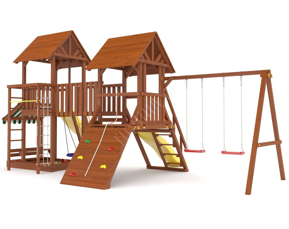 Конструкция выполнена из надёжного клееного бруса, соответствующего стандартам безопасности. Все металлические соединения закрыты пластиковыми заглушками, что делает площадку максимально безопасной для малышей.