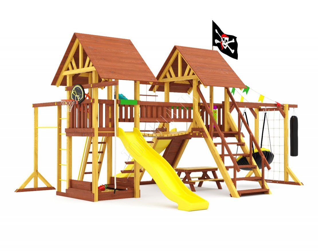Площадка Галиот 8 обладает довольно широким функционалом (который по желанию можно легко расширить). А на качелях могут кататься даже родители! Детская площадка предназначена для дачи, коттеджа.