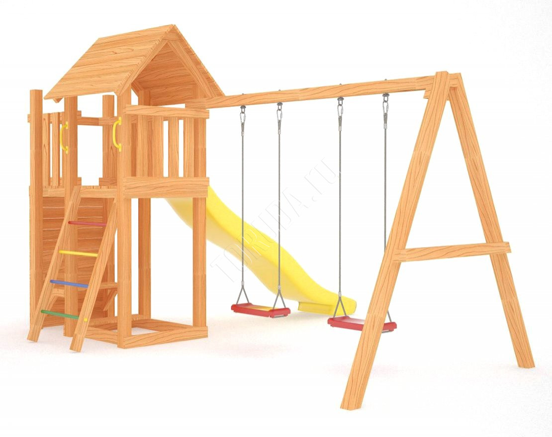 Комплекс безопасен: крепёжные соединения надёжно скрыты под колпачками, качельные подвесы выполнены по ГОСТ, спортивное бельгийское оборудование имеет дополнительный запас прочности.