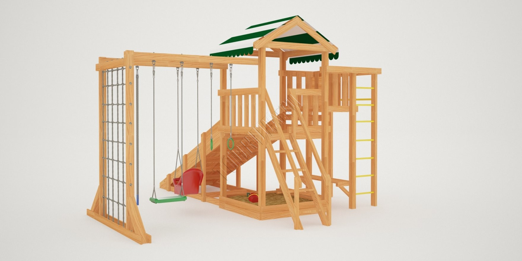 В основе натуральный материал – клееный брус 75х75 мм. Он отшлифован, углы скруглены, чтобы не получить занозы и ссадины. Конструкция и элементы качельных подвесов разработаны и произведены согласно ГОСТ. Дерево экологичное, прошло сертификацию, поставляется без покрытия и технологических отверстий.