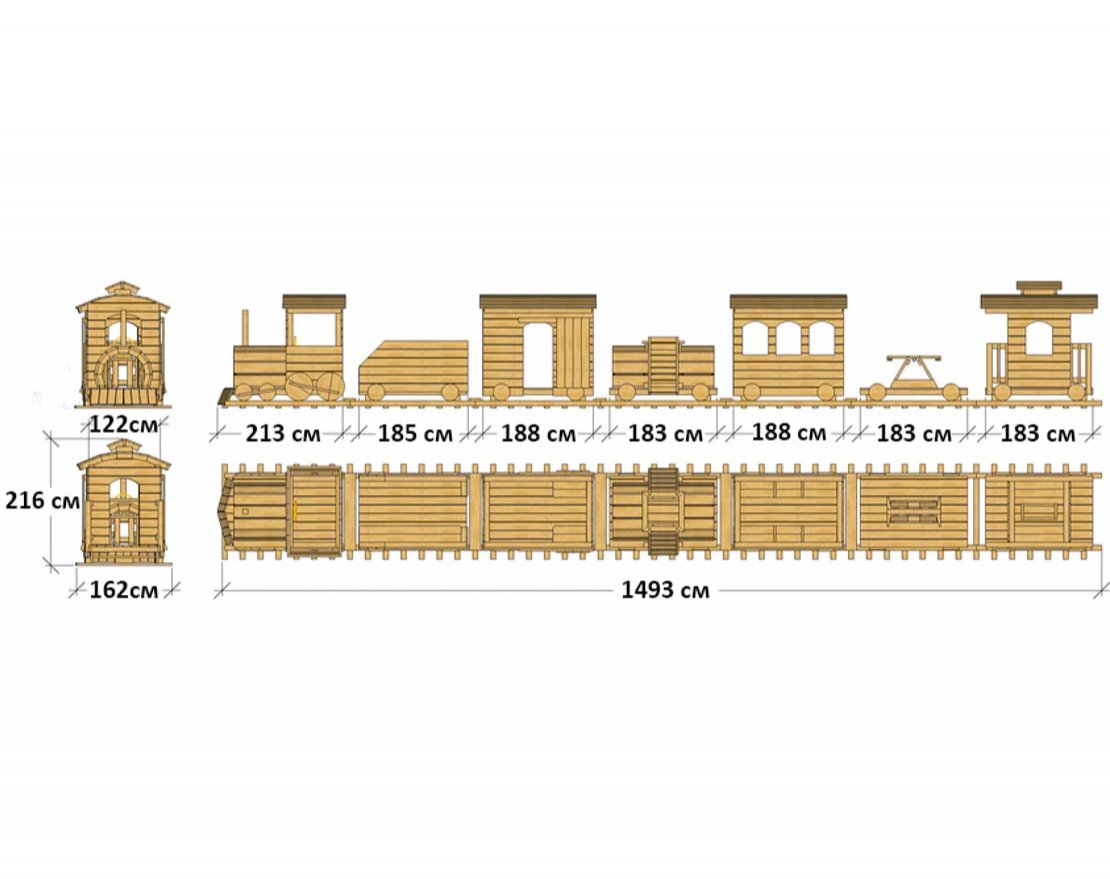 Игровой поезд состоит из 7 уникальных вагонов, каждый длиной 213см. и шириной 122см., а общая длина поезда почти 15 метров! Каждый из них предлагает что-то свое, с чем дети могут взаимодействовать и все они доставляют массу удовольствия. Осуществите мечту вашего ребенка, пусть у него будет свой собственный, персональный локомотив на игровой площадке!