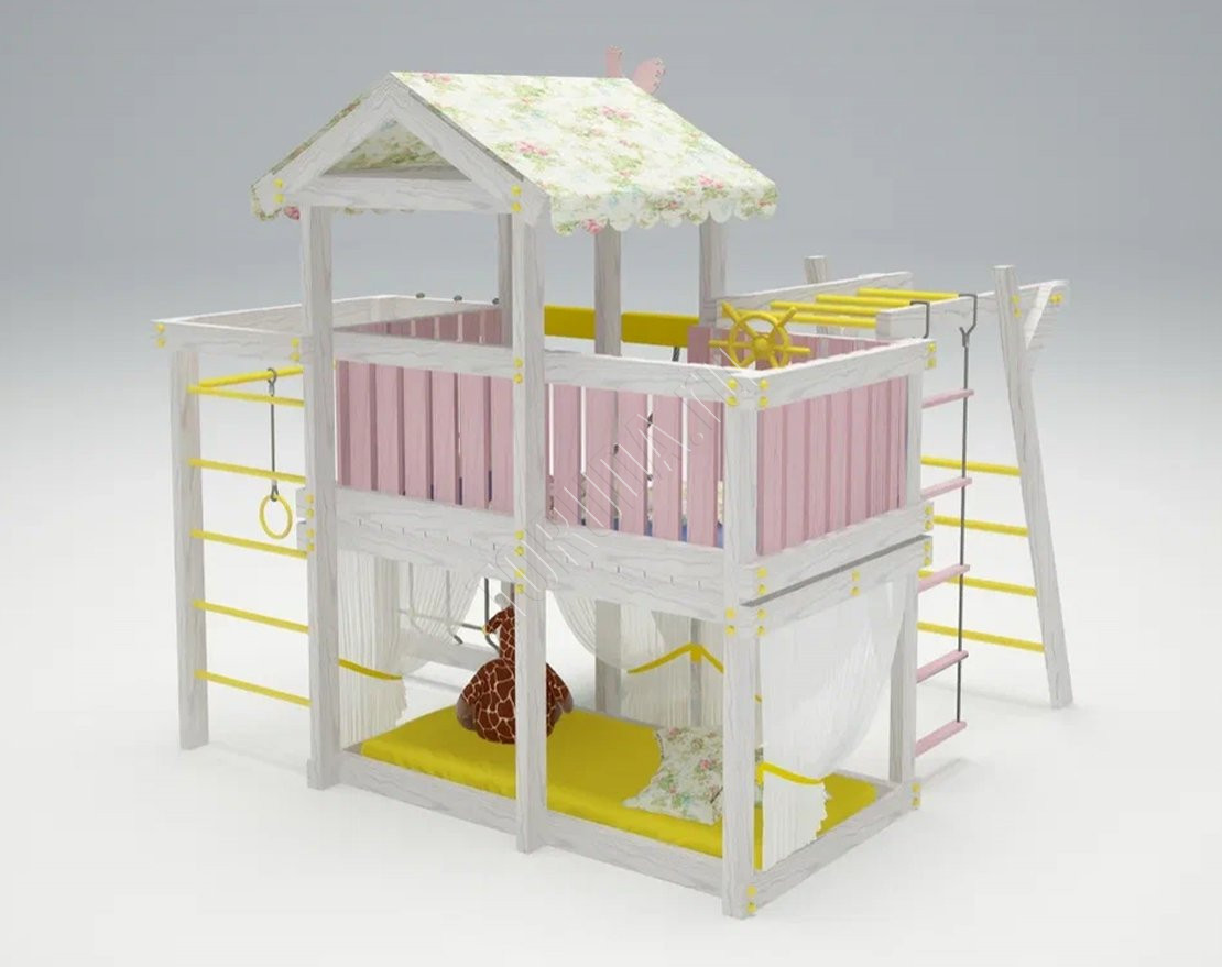 Двухъярусная площадка – разработана специально для большой семьи. Прочный каркас из массива хвойных пород выдержит нескольких детей.