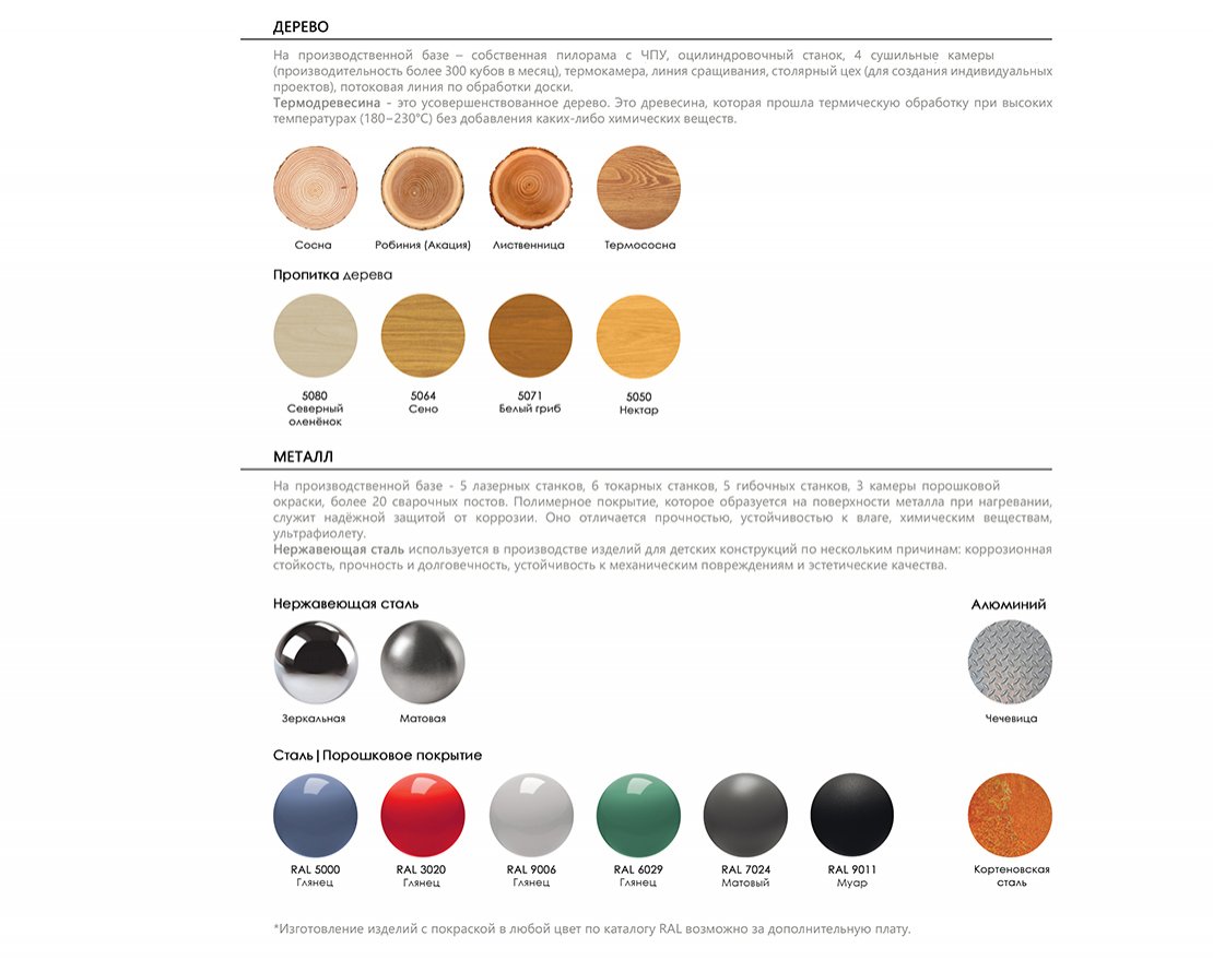 На производственной базе - 5 лазерных станков, 6 токарных станков, 5 гибочных станков, 3 камеры порошковой окраски, более 20 сварочных постов. Полимерное покрытие, которое образуется на поверхности металла при нагревании, служит надёжной защитой от коррозии. Оно отличается прочностью, устойчивостью к влаге, химическим веществам, ультрафиолету. Нержавеющая сталь используется в производстве изделий для детских конструкций по нескольким причинам: коррозионная стойкость, прочность и долговечность, устойчивость к механическим повреждениям и эстетические качества.