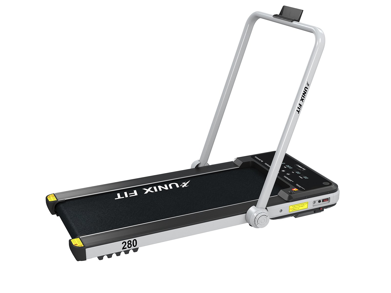 Беговую дорожку UNIXFIT R-280 можно убрать под диван или за дверь (толщина рамы составляет всего 14 см). Трехслойное беговое полотно (42,5*108 см) оптимально подходит для умеренных физических нагрузок, максимальная скорость бега составляет 10 км/ч.